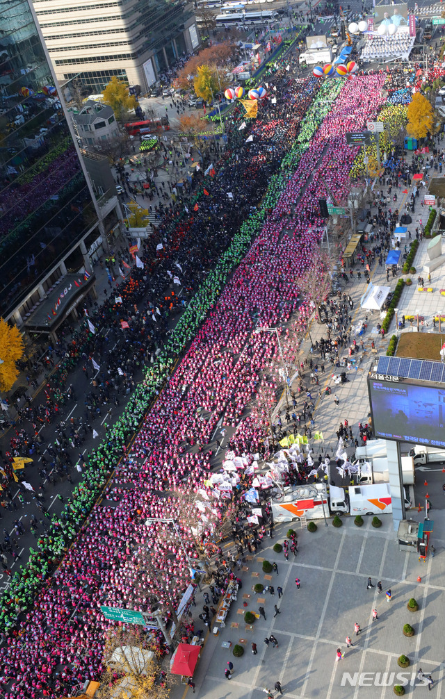 【서울=뉴시스】배훈식 기자 = 전태일 열사 정신계승 2018 전국노동자대회가 열린 10일 오후 서울 중구 태평로에서 전국민주노동조합총연맹 조합원들이 '적폐청산, 노조 할 권리, 사회대개혁' 등을 촉구하고 있다. 2018.11.10.