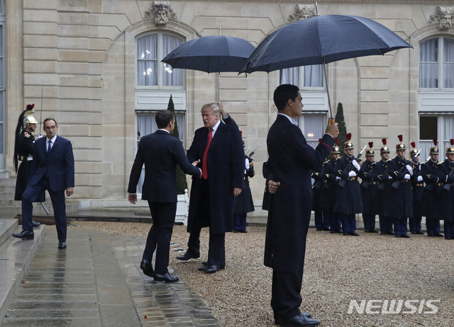 【파리=AP/뉴시스】도널드 트럼프 미 대통령이 10일 파리 엘리제궁에서 비가 내리는 가운데 에마뉘엘 마크롱 프랑스 대통령의 영접을 받고 있다. 1차 세계대전 종전 100주년 기념행사를 위해 프랑스를 방문한 트럼프 대통령은 이날 파리 동쪽 약 80㎞ 지점의 엔-마른 미군묘지를 찾아 헌화하고 묵념할 예정이었지만 악천후를 이유로 방문을 취소했다. 2018.11.11
