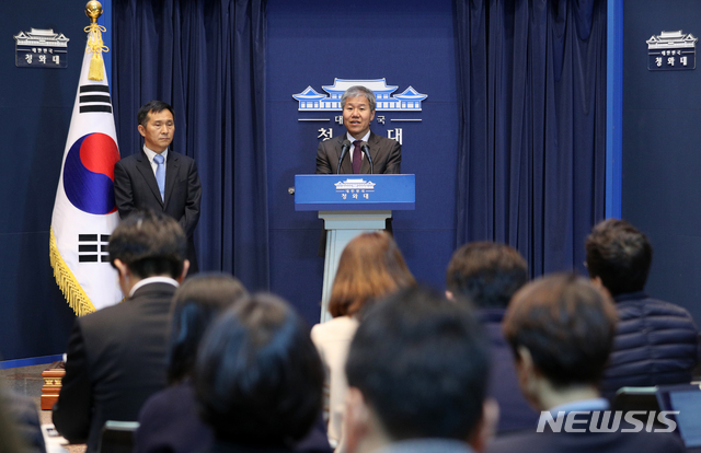 【서울=뉴시스】박진희 기자 = 김수현(오른쪽) 신임 대통령비서실 정책실장과 김연명 사회수석이 11일 오후 청와대 춘추관에서 기자간담회를 하고 있다. 2018.11.11.