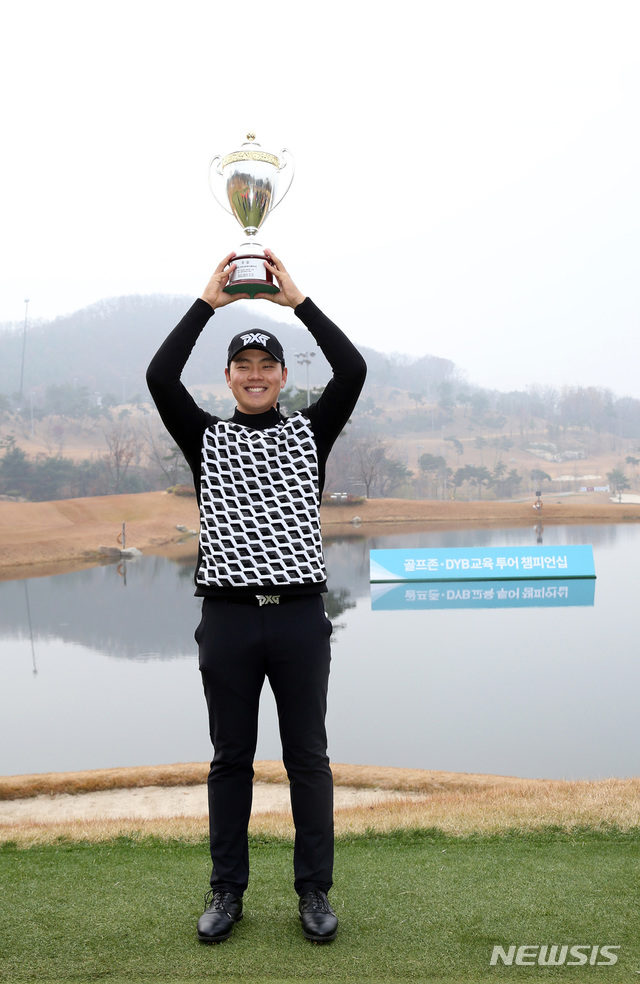 【서울=뉴시스】11일 경기도 안성 골프존카운티 안성H에서 열린 골프존 DYB교육 투어 챔피언십FR, 우승을 차지한 이정환 프로가 우승 세리머니를 하고 있다. 2018.11.11.(사진=KPGA 제공)