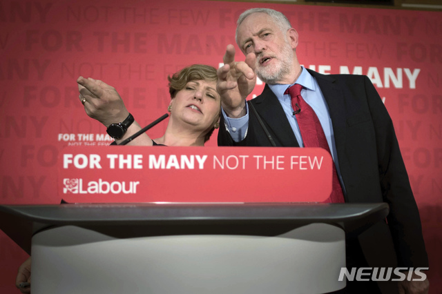 【베이즐던=AP/뉴시스】에밀리 손베리 영국 노동당 예비 내각 외무장관은 영국 의회가 브렉스트 합의안을 거부하면 새로운 국민투표를 실시하는 방안을 검토할 필요가 있다고 말했다. 사진은 2017년 6월1일 촬영한 사진으로 손베리 예비내각 외무장관(왼쪽)이 베이즐던에서 열린 총선 캠페인에서 기자들의 질문에 답하는 모습. 2018.11.11