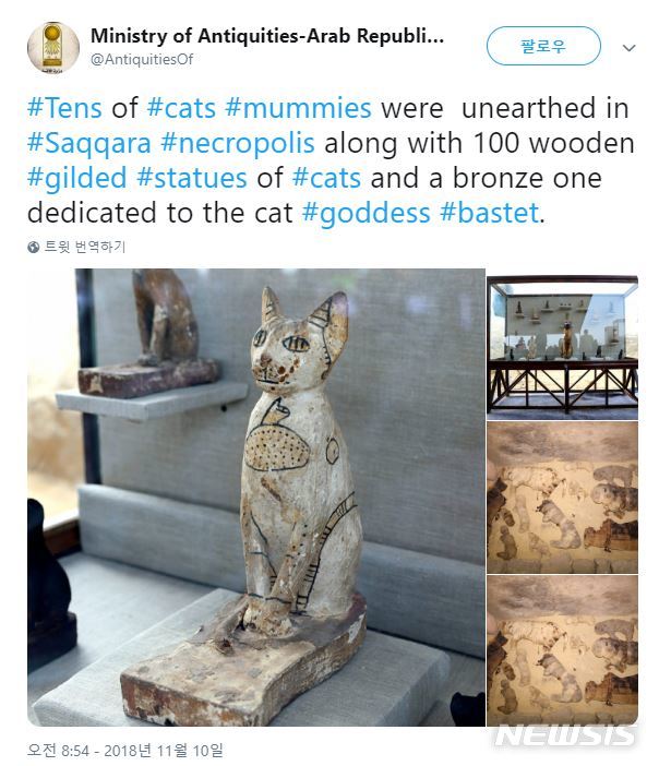 【서울=뉴시스】 이집트에서 고대 이집트 미라 등 백여점의 유물을 발굴했다. 사진은 10일(현지시간) 이집트 당국이 트위터를 통해 이번에 발굴된 고양이 유물 중 일부를 공개한 사진. (사진=트위터 캡쳐) 2018.11.12.