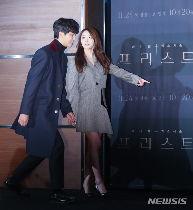 【서울=뉴시스】조수정 기자 = 배우 연우진, 정유미(오른쪽)가 OCN주말드라마 '프리스트' 제작발표회가 열린 12일 오후 서울 영등포구 여의도동 콘래드서울호텔에서 입장하고 있다. '프리스트'는 24일 밤 10시 20분 첫방송된다. 2018.11.12. [email protected]