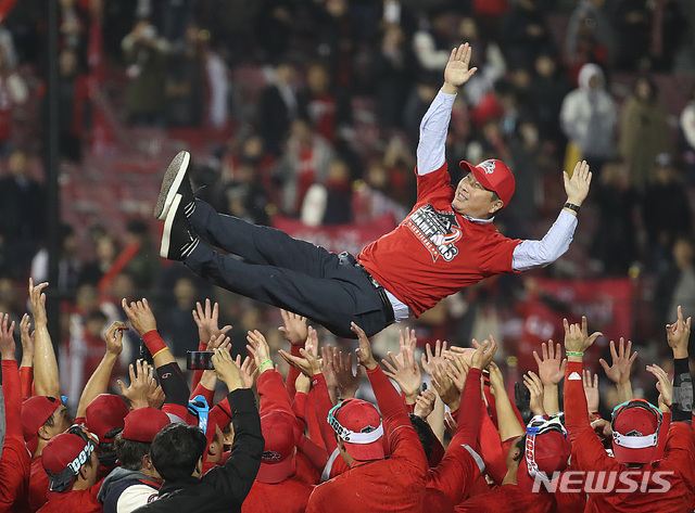 【서울=뉴시스】김진아 기자 = 12일 오후 서울 송파구 잠실야구장에서 열린 2018 프로야구 두산 베어스와 SK 와이번스의 한국시리즈 6차전 경기, 13회 연장 끝에 5대4로 승리한 SK선수들이 SK 최태원 회장을 헹가레 치고 있다. 2018.11.12.