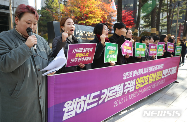 이들은 웹하드 카르텔과 관련해 양진호의 로봇개발 자금출처에 대한 의혹을 제기, 탈세 혐의를 전면 조사할 것을 요구했다. 2018.11.13.