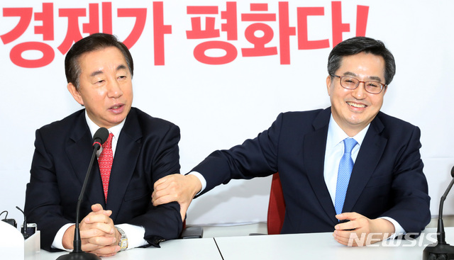 【서울=뉴시스】박영태 기자 = 김동연(오른쪽) 경제부총리 겸 기획재정부 장관이 13일 오후 서울 영등포구 여의도 국회에서 자유한국당 김성태 원내대표를 만나 예산안 처리 협조를 요청하고 있다. 2018.11.13.