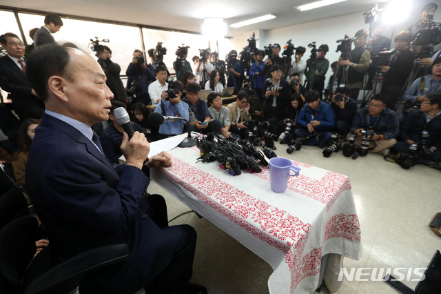 【서울=뉴시스】이종철 기자 = 전원책 변호사가 14일 오후 서울 여의도 극동VIP빌딩에서 기자 간담회를 갖고 입장을 밝히고 있다. 2018.11.14. [email protected]