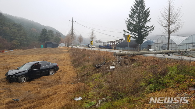 【홍천=뉴시스】박종우 기자 = 15일 오전 강원 홍천군 화촌면 구성포리의 한 도로에서 그랜져 승용차가 전봇대를 들이받는 사고가 발생했다. 2018.11.15. [email protected]