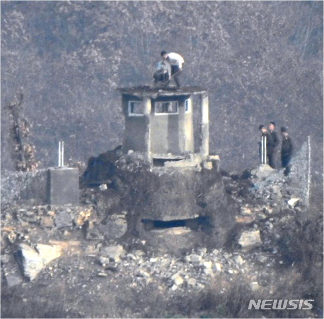 【서울=뉴시스】 국방부는 15일 북한의 중부전선 GP 철거 모습을 공개했다. 사진은 지난 10일 북한군들이 GP 철거를 시작하는 모습. 2018.11.15. (사진=국방부 제공) [email protected]