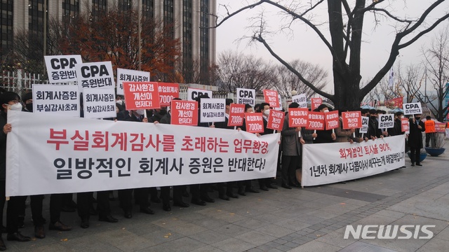【서울=뉴시스】 김정호 기자 = 16일 오전 정부서울청사 정문 앞에서 열린 공인회계사 증원 반대 집회에서 참가자들이 피켓 시위를 벌이고 있다. 이날 집회에는 온라인 커뮤니티를 통해 조직된 '공인회계사증원반대모임' 회계사 100여명이 참가했다. 2018.11.16.