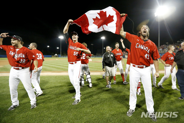 【온타리오=AP/뉴시스】 SK 와이번스는 16일 외국인 투수 브록 다익손(24)과 계약을 체결했다고 밝혔다. 다익손(백넘버 55)이 지난 2015년 팬암대회에서 캐나다 대표팀으로 출전해 미국을 꺾고 우승을 차지해 기쁨을 만끽하고 있다.