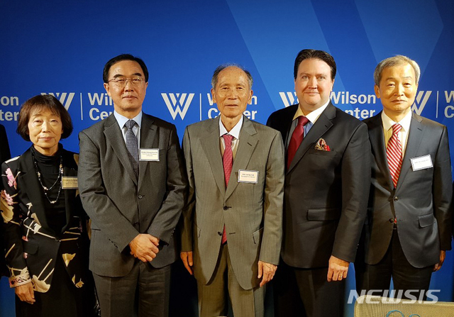 【창원=뉴시스】강경국 기자 = 2018 한반도 국제포럼(KGF) 미국회의가 지난 15일 미국 워싱턴D.C. 우드로윌슨센터에서 개최된 가운데 (왼쪽부터)김선향 북한대학원대학교 이사장, 조명균 통일부 장관, 박재규 경남대 총장, 마크 내퍼 미 국무부 동아태 부차관보, 안호영 북한대학원대학교 총장이 기념촬영을 하고 있다. 2018.11.16. (사진=경남대학교 제공)