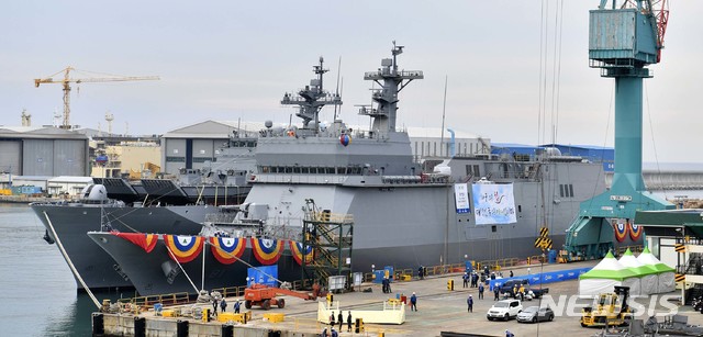 【서울=뉴시스】 16일 울산 현대중공업에서 진수식을 앞둔 대한민국 해군의 첫 훈련함 '한산도함(ATH-81)'이 부두에 정박되어 있다. 한산도함 옆에 계류하고 있는 함정은 울산 현대중공업에서 건조중인 신형상륙함 노적봉함(왼쪽)이다.
