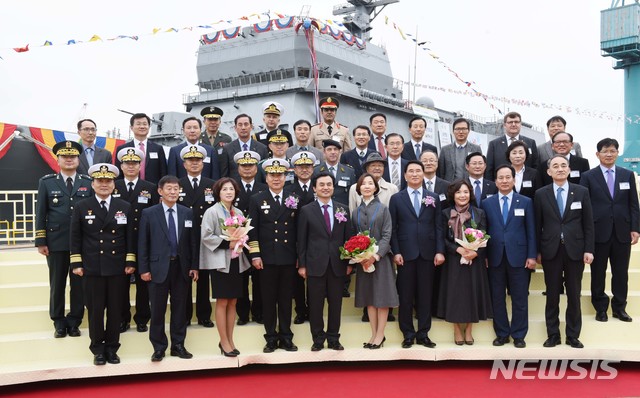 【울산=뉴시스】배병수 기자 = 사상 첫 해군 훈련함 ‘한산도함’ 진수식이 16일 오후 울산시 중구 현대중공업 특수선사업부에서 행사가 끝난 뒤 심승섭(사진 앞줄 왼쪽 네번째) 참모총장, 한영석(사진 앞줄 오른쪽 네번째) 현대중공업 대표이사, 황세영(사진 앞줄 오른쪽 두번째) 울산시의회 의장 등 내빈들이 기념촬영을 하고 있다. 2018.11.16.