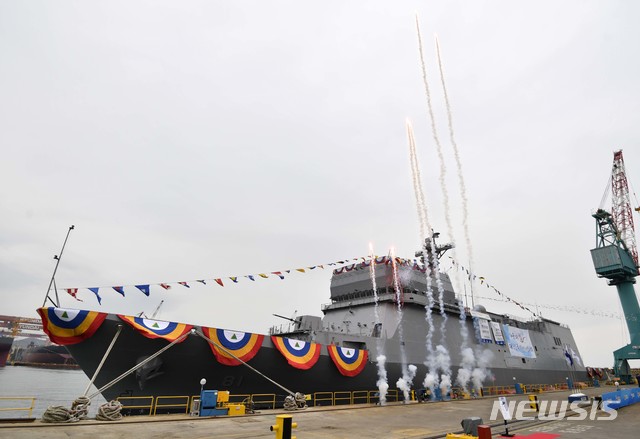 【서울=뉴시스】 16일 오후 울산 현대중공업에서 대한민국 해군의 첫 훈련함 '한산도함(ATH-81)' 진수식이 열리고 있다.