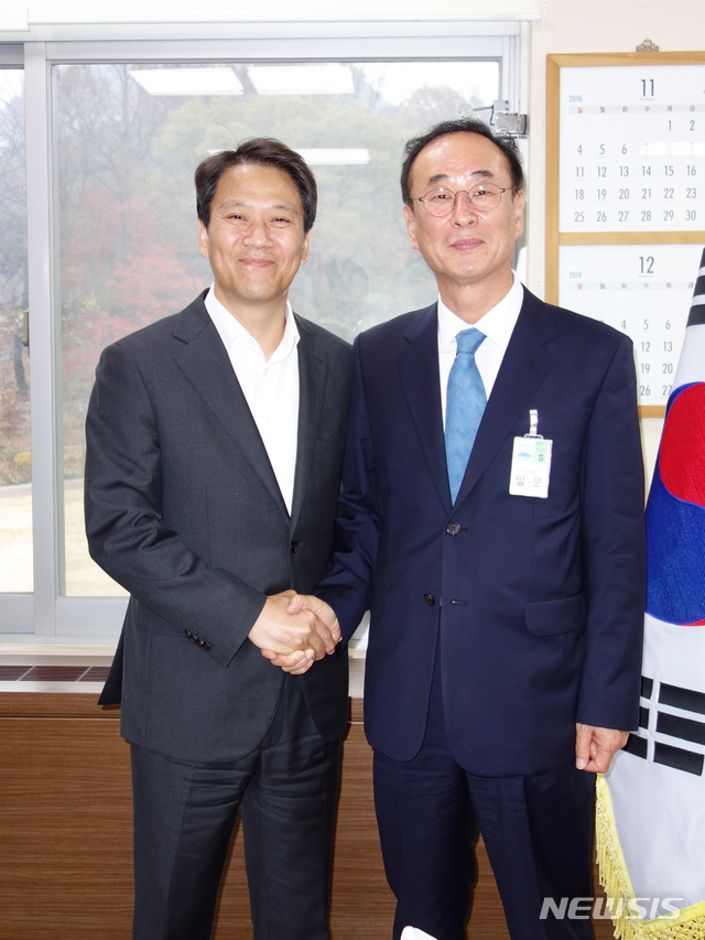 【구미=뉴시스】박홍식 기자 = 장세용(오른쪽) 경북 구미시장이 16일 청와대를 방문해 임종석 비서실장과 기념촬영을 하고 있다. 장 시장은 이날 청와대 비서실을 찾아 지역현안 문제 등 중점시책을 설명한 후 관심과 지원을 요청했다. 2018.11.17 (사진=구미시 제공)