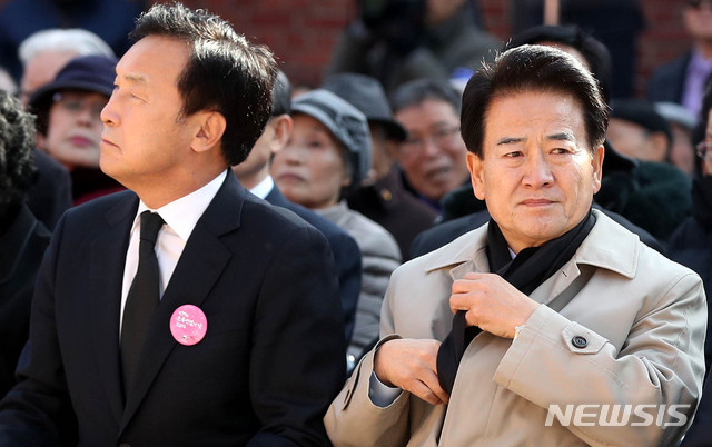 【서울=뉴시스】추상철 기자 = 제79회 순국선열의 날 기념식이 열린 17일 오전 서울 서대문구 서대문형무소역사관에서 손학규 바른미래당 대표와 정동영 민주평화당 대표가 서로 다른 곳을 응시하고 있다. 2018.11.17.