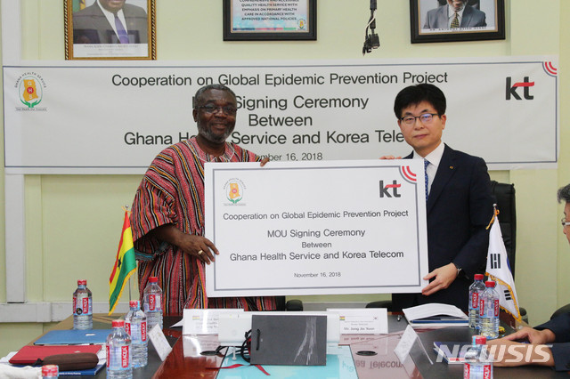 【서울=뉴시스】 빅데이터를 활용한 감염병 확산방지 시스템 구축 협력 MOU 체결식에서 안소니 나시아 아사레 가나보건청장(왼쪽)과 KT 홍보실장 윤종진 부사장이 기념촬영을 하고 있다. 2018.11.18. (사진=KT 제공)