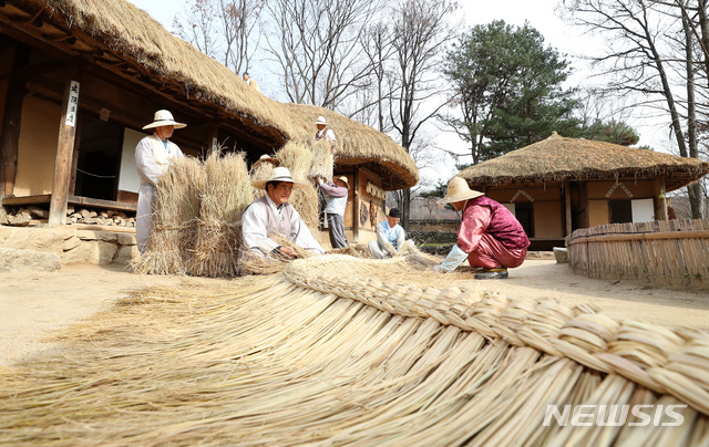 【용인=뉴시스】이영환 기자 = 18일 오후 경기 용인 한국민속촌에서 어르신들이 볏짚을 사용해 지붕에 얹을 용마름과 이엉잇기 작업을 하며 바짝 다가온 겨울을 준비하고 있다. 2018.11.18.