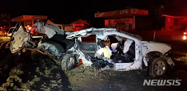 【홍성=뉴시스】함형서 기자 = 20일 오전 1시 15분께 충남 홍성군 홍성읍 소향리 소향삼거리에서 술에 취한 A(23)씨가 몰던 티볼리 렌터카가 신호등을 들이 받아 6명 사상자가 발생했다. 2018.11.20.(사진 홍성소방서 제공)