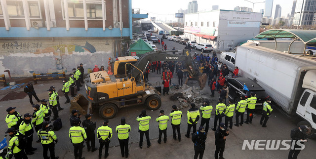 【서울=뉴시스】추상철 기자 = 20일 오후 서울 동작구 구 노량진수산시장에서 수협이 굴착기를 투입해 시장 폐쇄작업이 진행되는 과정속 상인과 용역직원, 경찰과 대치 상황이 이뤄지고 있다. 2018.11.20.