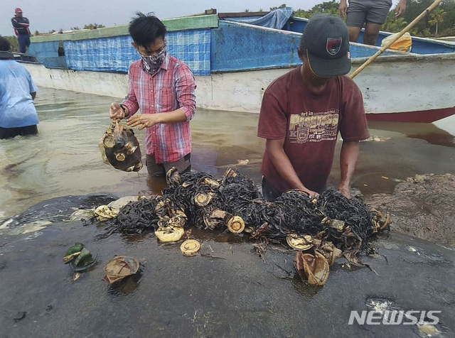 【 AP/뉴시스】인도네시아 동부 술라웨시주 와카토비섬에서 19일 밤 해변에 떠밀려온 고래 사체의 위 속에서 5.9㎏에 달하는 엄청난 플라스틱 쓰레기들이 쏟아져 나왔다.와카토비자연공원의 헤리 산토소 소장은 20일 길이 9.5m에 이르는 향유고래의 배 속을 검사한 결과 플라스틱 컵 115개, 플라스틱 병 4개, 플라스틱 백 25개와 플립플롭(엄지와 검지 발가락 사이에 끈을 끼워 신는 샌들) 2개 등 1000개가 넘는 엄청난 플라스틱 조각들이 발견됐다고 밝혔다. 사진은 사람들이 고래 배에서 나온 쓰레기들을 살펴보고 있는 모습. 사진은 와카토비 해양어업공동체 아카데미가 제공한 것이다. 2018.11.21