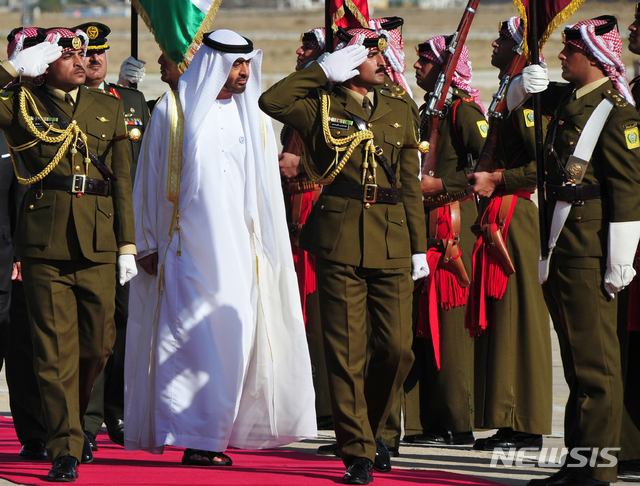 【암만(요르단)=뉴시스】 채정병 기자 = 20일(현지시간) 요르단을 방문한 세이크 무함마드 빈 자이드 UAE 아부다비 왕세자가 마르카 공항 도착 직후 요르단 의장대를 사열하고 있다.