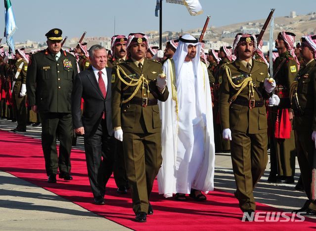 【암만(요르단)=뉴시스】 채정병 기자 = 20일(현지시간) 요르단을 방문한 세이크 무함마드 빈 자이드 UAE 아부다비 왕세자가 압둘라 2세 요르단 국왕과 의장대를 사열하고 있다.