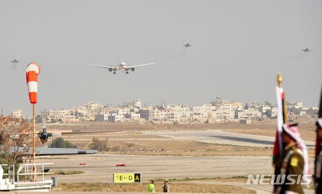 【암만(요르단)=뉴시스】 채정병 기자 = 20일(현지시간) 세이크 무함마드 빈 자이드 UAE 아부다비 왕세자를 태운 전용기가 요르단 공군 전투기의 호위를 받으며 마르카 공항에 도착하고 있다.
