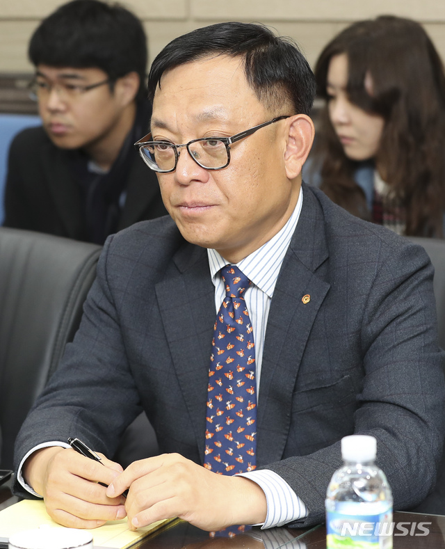 【서울=뉴시스】최진석 기자 = 권희백 한화투자증권 대표이사가 21일 서울 마포구 성장성 특례상장 1호 기업인 바이오업체 셀리버리에서 열린 '자본시장 혁신을 위한 현장감담회'에 참석해 최종구 금융위원장의 모두발언을 경청하고 있다. 2018.11.21.