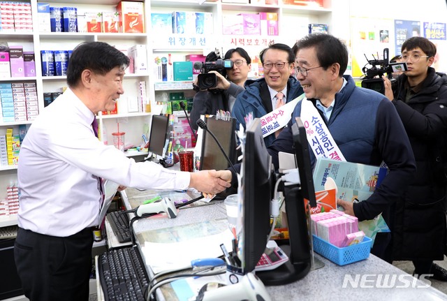 【서울=뉴시스】조성봉 기자 = 박원순 서울시장이 22일 오전 서울 서대문구 신촌 일대 약국에서 제로페이 가입독려 캠페인을 벌이고 있다.