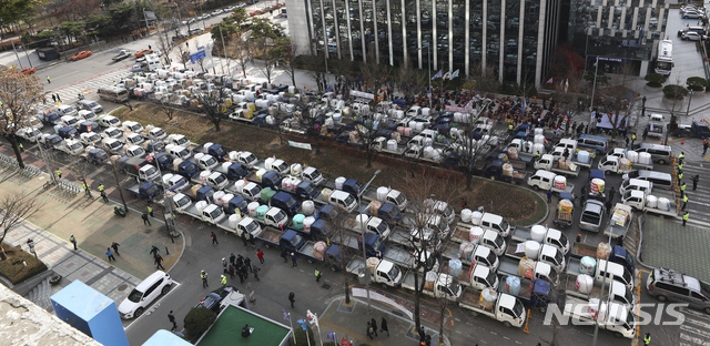 【서울=뉴시스】최진석 기자 =  22일 서울 영등포구 여의도 수출입은행 앞에서 열린 전국농민회총연맹(전농) '밥 한 공기 300원 보장! 쌀 목표가격 24만원 쟁취! 농민결의대회'에 참가한 농민들이 끌고온 차량이 도로에 세워져 있다.  2018.11.22.