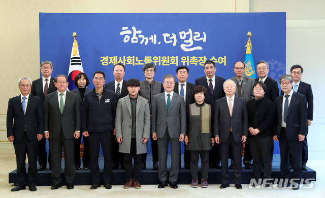 앞줄 왼쪽부터 문성현 경제사회노동위원회 위원장, 강호갑 한국중견기업연합회 회장, 김주영 한국노총 위원장, 김병철 청년유니온 위원장, 문재인 대통령, 나지현 전국여성노동조합 위원장, 손경식 한국경영자총협회 회장, 김진 민변 노동사회 위원장, 박태주 경제사회노동위원회 상임위원, 김동연(뒷줄 오른쪽부터) 경제부총리, 이계안 전 현대자동차 대표, 이남신 한국비정규노동센터 소장, 최승재 소상공인연합회 회장, 박성택 중소기업중앙회 회장, 박봉정숙 여성민우회 대표, 박용만 대한상의 회장, 신연수 동아일보 미래전략연구소장, 강호갑 한국중견기업연합회 회장. 2018.11.22.