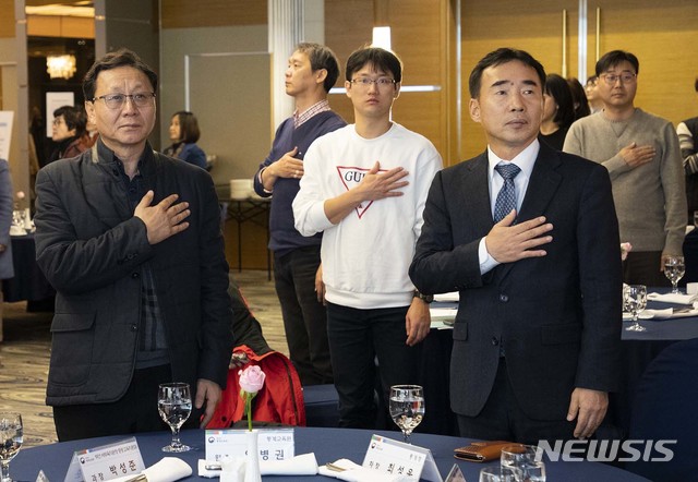 【서울=뉴시스】 23일 부산 코모도호텔에서 열린 ‘효율적 실용 통계교육 방법 설명회’에서 최성욱(오른쪽) 통계청 차장이 임병권 통계교육원장과 함께 국민의례를 하고 있다. 2018.11.23. (사진=통계청 제공)