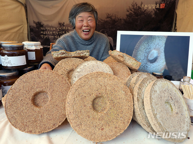 【서울=뉴시스】이영환 기자 = 25일 경기 파주시 임진각 광장과 평화누리 일원에서 열린 '제22회 파주장단콩축제'에서 한 상인이 원형 메주를 선보이고 있다. 2018.11.25.(사진=파주장단콩축제추진위원회 제공)
