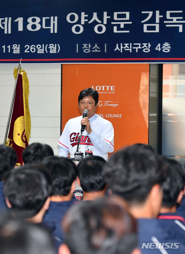 【부산=뉴시스】 하경민 기자 = 26일 부산 동래구 사직야구장 4층 강당에서 열린 롯데 자이언츠 신임 감독 취임식에 참석한 양상문 감독이 취임사를 하고 있다. 2018.11.26.