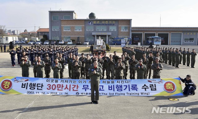 【서울=뉴시스】 26일 경남 사천시 공군 제3훈련비행단에서 열린 '30만시간 무사고 비행기록 달성 기념식'에서 비행단 장병들이 무사고 비행기록을 축하하고 있다. 2018.11.26. (사진=공군 제공)