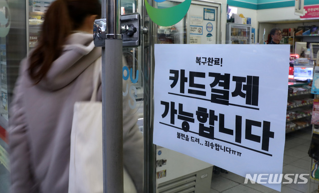 【서울=뉴시스】이영환 기자 = 지난 24일 KT 아현지사 화재로 인한 통신 불량으로 카드 결제에 장애를 겪고 있는 26일 오후 서울 서대문구 신촌의 한 편의점에 카드결제 가능 안내문구가 붙어 있다.