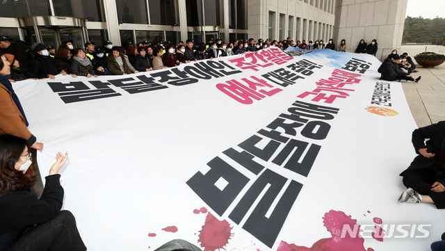 【서울=뉴시스】홍효식 기자 = 27일 오후 서울 여의도 국회 본청 앞에서 전국장애인부모연대 회원들이 '발달장애인 주간활동서비스' 예산 증액을 촉구하며 대형 현수막 시위를 벌이고 있다. 2018.11.27.