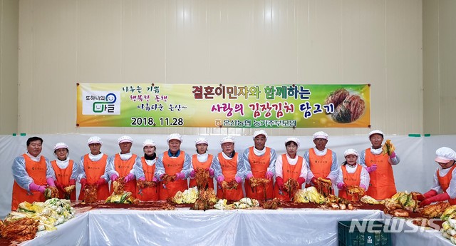【울산=뉴시스】조현철 기자 = 온산농협(조합장 정차길) 농가주부모임(회장 박정례)은 28일 오전온산농협 삼평경제사업장에서 2018년 결혼 이민자와 함께하는 사랑의 김장김치 담그기 행사를 갖고 배추 500포기 분량의 김장 김치를 담아 경로당 40곳과 온산읍 결혼이민자가정 20명, 불우이웃가정 20곳의 가정에 전달했다. 2018.11.28. (사진=울산농협 제공)