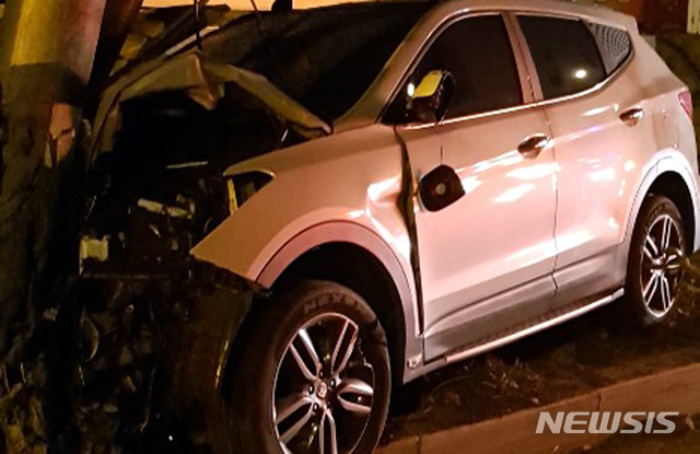【광주=뉴시스】류형근 기자 = 27일 오후 10시50분께 광주 광산구 비아동 한 도로에서 SUV차량이 가로수와 전신주 등을 잇따라 받은 뒤 운전자는 도주하는 사고가 발생, 경찰이 추적하고 있다. 2018.11.28. (사진=독자 제공)