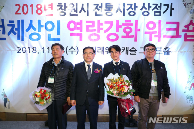 【창원=뉴시스】강경국 기자 = 28일 경남 창원시 의창구 미래웨딩캐슬에서 전통시장 상인 역량강화 워크숍이 열린 가운데 허성무 창원시장이 참석자들과 기념촬영을 하고 있다. 2018.11.29. (사진=창원시청 제공)