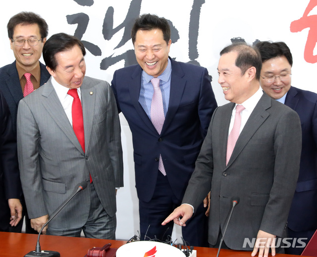 【서울=뉴시스】박영태 기자 = 29일 오전 서울 영등포구 여의도 국회에서 열린 오세훈 前 서울시장 입당 환영식에서 오세훈 전 서울시장이 김병준 비대위원장, 김성태 원내대표 등 참석자들과 밝게 웃고 있다. 2018.11.29.