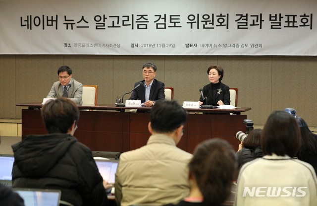 【서울=뉴시스】박진희 기자 = 네이버 뉴스 알고리즘 검토 위원회 맹성현(가운데, 한국과학기술원 전산학부 교수) 위원장, 김용찬(왼쪽, 연세대 언론홍보영상학과 교수) 위원, 장윤금(숙명여대 문헌정보학과 교수) 위원들이 29일 오전 서울 중구 프레스센터에서 '네이버 뉴스 알고리즘 검토 위원회 결과 발표회'를 하고 있다. 2018.11.29.