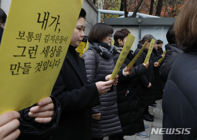 【서울=뉴시스】최동준 기자 = 안희정 성폭력사건 공동대책위원회가 29일 서울 서초구 서울고등법원 앞에서 '보통의 김지은들이 만드는 보통의 기자회견'을 열고 안희정 전 충남지사 처벌을 촉구하고 있다. 2018.11.29.