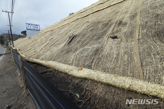 【말리부( 미 캘리포니아주) = AP/뉴시스】 미국 캘리포니아주의 말리부 근교에 있는 고속도로변에 29일(현지시간) 폭우로 인한 붕괴를 막기 위해 그물이 설치돼있다. 그동안 극심한 산불로 벌거숭이가 된 이 곳 산악지대에서는 진흙 산사태와 홍수 쓰레기 유입에 대한 경보와 주민대피령이 내려졌다. 2018.11.30