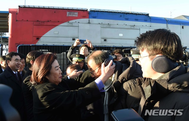 【파주=뉴시스】사진공동취재단 = 30일 경기도 파주 도라산역에서 열린 남북철도현지공동 조사단 환송식에서 박순자 국회국토교통위원장 등이 조사단원들에게 귀마개를 씌워주고 있다. 2018.11.30.