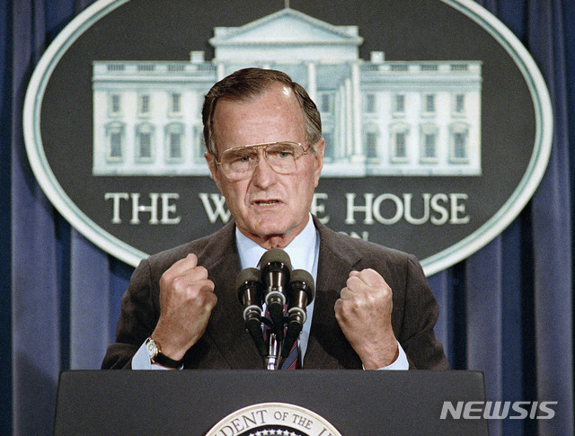 【워싱턴=AP/뉴시스】조지 H.W. 부시 전 미국 대통령이 30일(현지시간) 94세를 일기로 별세했다. 사진은 1989년 6월5일 촬영한 사진으로 부시 당시 대통령이 백악관에서 기자회견을 여는 모습. 그의 부인 바바라 부시 여사는 지난 4월17일 별세했다. 2018.12.01