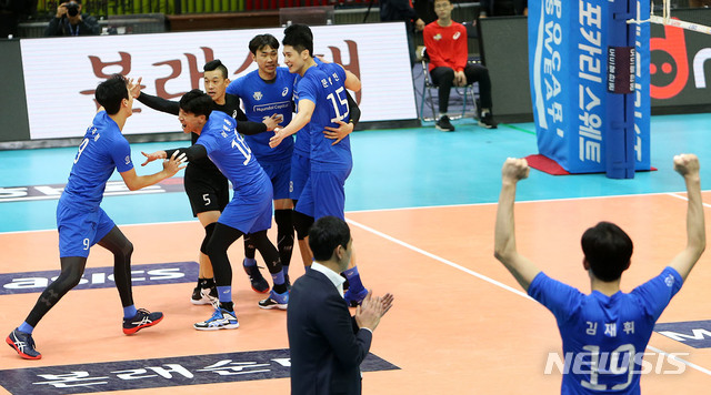 【서울=뉴시스】1일 경기도 수원시 장안구 수원실내체육관에서 열린 2018-2019 도드람 V리그 현대캐피탈 스카이워커스 대 한국전력 빅스톰 경기에서 현대캐피탈 선수들이 환호하고 있다. 2018.12.01.(사진=현대캐피탈 배구단 제공)