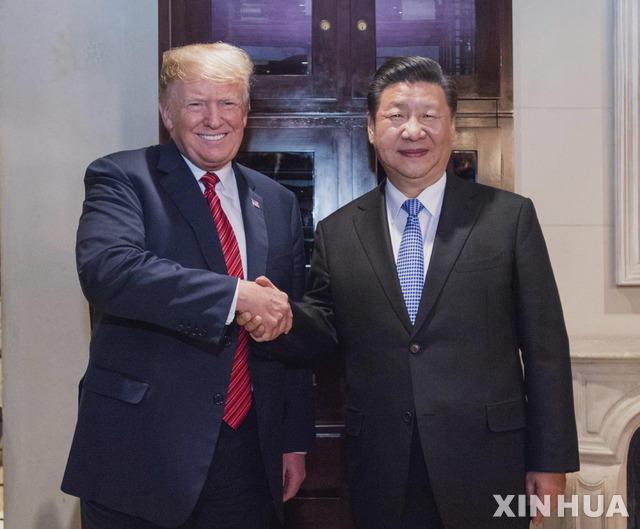 【부에노스아이레스=신화/뉴시스】1일(현지시간) 아르헨티나 부에노스아이레스에서 도널드 트럼프 미국 대통령과 시진핑 중국 국가주석이 만찬 회동에서 악수하고 있다. 악화일로를 걷던 미중 무역갈등은 이날 회동을 통해 휴전으로 일단 봉합됐다. 2018.12.02